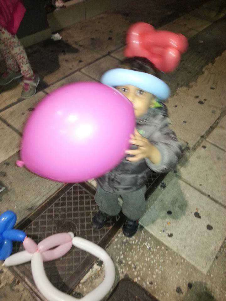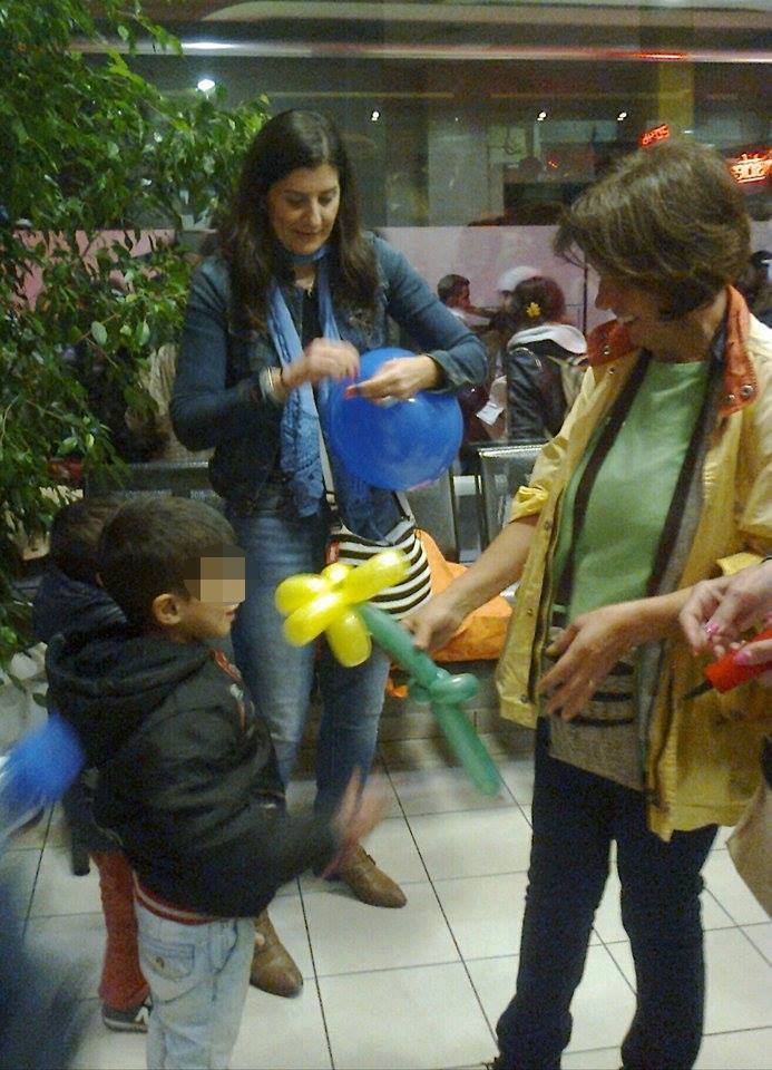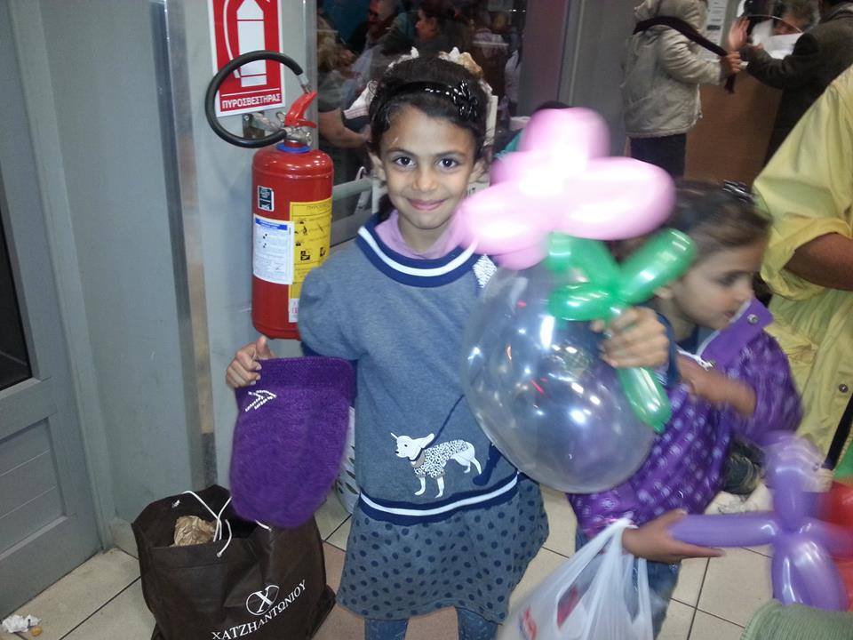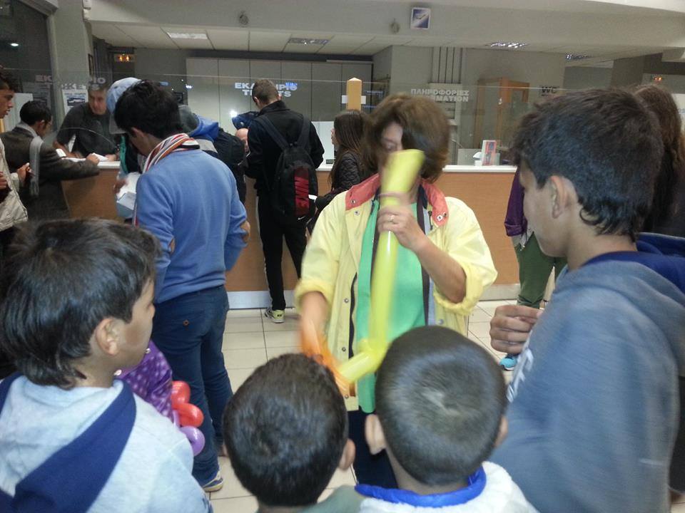 Ήρθε τότε η Πιπίτσα και ερχίσαμε να φτιάχνουμε, δηλαδή εκείνη τα έφτιαχνε, λουλούδια με τα μπαλόνια! Μοιράσαμε μερικά όμως μας έσκαγαν και άλλα και γελούσαμε. Πήγαμε στο ΚΤΕΛ και εκεί έφτιαξε περισσότερα. Τα παιδιά ξετρελλάθηκαν και κάποια περίμεναν για ώρα το δικό τους λουλουδάκι! Ήρθε η Αδέλα και μας είπε να πάμε προς μία οικογένεια που ήταν 9 ενήλικες και 9 παιδιά που θα έμεναν έξω για το βράδυ και δεν θα έφευγαν με το πλοίο. Πήγαμε και αρχίσαμε να φτιάχνουμε μπαλόνια στα παιδιά. Η χαρά τους μεγάλη. Έπαιζαν με τα μπαλόνια και μαζί με την κόρη της Αδέλας. Παιδιά… από άλλες χώρες, με διαφορετικές θρησκείες, κάτω από διαφορετικές συνθήκες στις ζωές τους.. που όμως οι ζωές τους ενώθηκαν για κάποιες στιγμές και έτσι απλά έπαιζαν μαζί πετώντας τα μπαλόνια το ένα στο άλλο! Δεν γνώριζε το ένα την γλώσσα του άλλου αλλά και δεν χρειαζόταν.. το παιχνίδι τους αρκούσε. Αυτό που θέλουν όλα τα παιδιά.. ειρήνη και παιχνίδι. Τα χαμόγελά μας ήταν πολλά και ζέσταιναν την καρδιά μου. Ο ένας πατέρας ήρθε κοντά μου και μου μίλησε.. μου είπε ότι θα λέει σε όλους για την μεγάλη ανθρωπιά των Ελλήνων. Μου μίλησε για την μεγάλη ιστορία της Ελλάδας που την μάθαιναν και στο σχολείο τους, για τον Πλάτωνα, τον Σωκράτη και τους σοφούς μας και την χώρα μας που υπήρξε το κέντρο του πολιτισμού. Μου είπε ότι το μόνο που θέλουν είναι να γίνει ειρήνη στην χώρα τους. Είχαν τα πάντα πρίν λίγα χρόνια και ζούσαν καλά και τώρα ξαφνικά έχασαν το πολυτιμότερο αγαθό… την ειρήνη. Με ρώτησε αν εγώ θα ήθελα να αφήσω την Ελλάδα με την μεγάλη ιστορία γιατί υπάρχει πόλεμος. Του είπα όχι θα ήθελα να υπάρχει πάντα ειρήνη. Μου είπε ότι θέλουνε να πούμε στον κόσμο να σταματήσει ο πόλεμος στην Συρία. Άρχισα να κλαίω.. δεν μπορούσα να κρατηθώ άλλο…. Έβαλε το χέρι του στην τσέπη του και έβγαλε και μου έδωσε ένα μαντήλι να σκουπιστώ… μου είπε «μην κλαίς!» Συνεχίσαμε την κουβέντα μας για αρκετή ώρα, για τον πόλεμο, για την κακοποίηση της θρησκείας του Ισλάμ από τους φανατικούς που δημιουργούν πολέμους στο όνομα της θρησκείας. Αυτός ο Σύρος νεαρός πατέρας ήταν φαρμακοποιός, έχασε το σπίτι του και 2 αδερφούς στον πόλεμο της Συρίας.. !