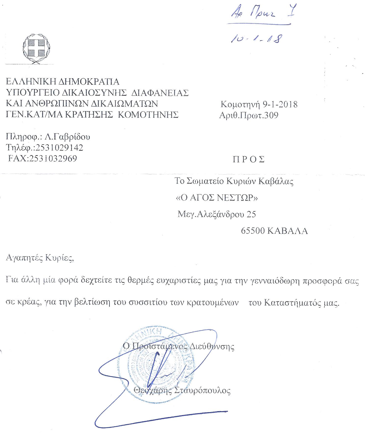 Ευχαριστήρια από καταστήματα κράτησης Κομοτηνής