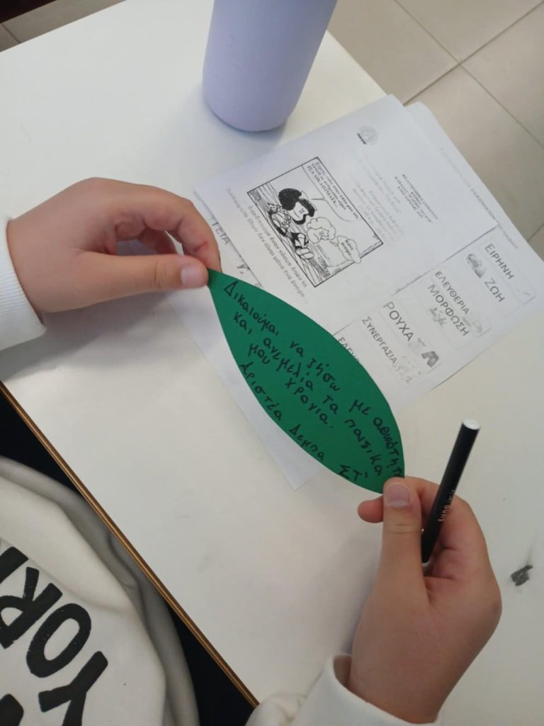 Ακολούθησε κατόπιν η δράση να φτιάξουν το δένδρο των ΔΙΚΑΙΩΜΑΤΩΝ. Κάθε παιδί έγραψε μόνο του επάνω στα πράσινα φυλλαράκια που του δόθηκαν ένα από τα δικαιώματα , το όνομά του και την τάξη του και τα κόλλησε στον πίνακα με το ΔΕΝΔΡΟ ΤΩΝ ΔΙΚΑΙΩΜΑΤΩΝ. Το δένδρο αυτό από εδώ και μετά θα στολίζει κάποιο χώρο του σχολείου για να θυμίζει την εκδήλωση που έγινε την 18η Νοεμβρίου 2024. Όση ώρα τα παιδιά έγραφαν και κολλούσαν τα φυλλαράκια τους η αίθουσα θύμιζε ένα πολύβουο μελίσσι!!!
