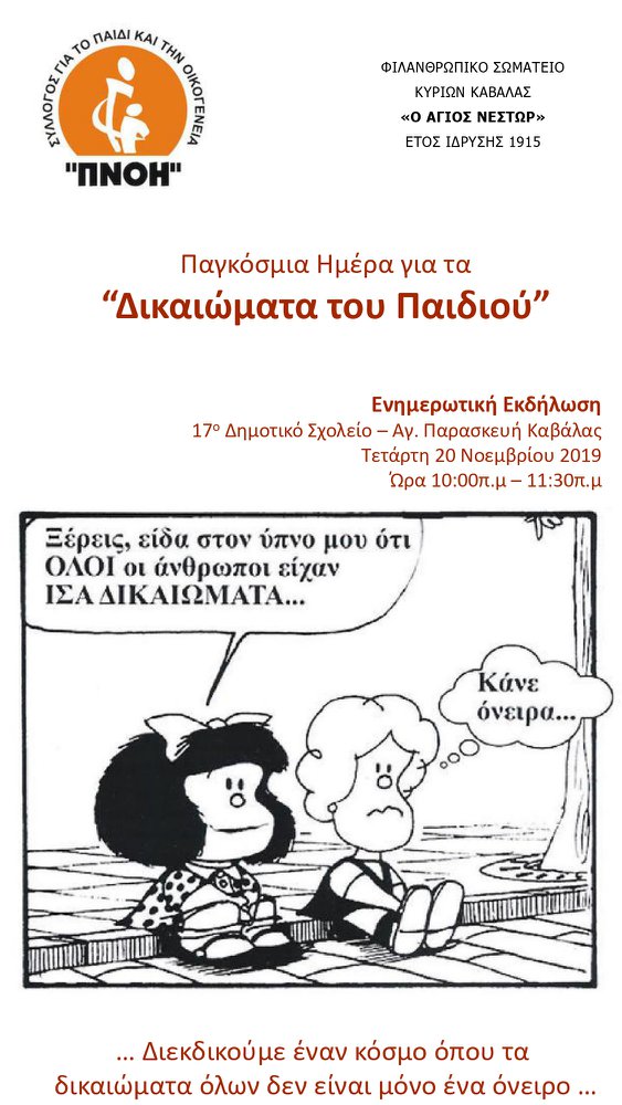 Σήμερα Τετάρτη 20 Νοεμβρίου 2019 είναι η Παγκόσμια ημέρα για «ΤΑ ΔΙΚΑΙΩΜΑΤΑ ΤΟΥ ΠΑΙΔΙΟΥ». Εδώ και χρόνια ι το Φιλανθρωπικό Σωματείο Κυριών Καβάλας « Ο Άγ. Νέστωρ» και ο Σύλλογος «ΠΝΟΗ» για το Παιδί και την Οικογένεια να συνδιοργανώνουμε μια δράση για τους μαθητές και τις μαθήτριες των Δημοτικών σχολείων της πόλης μας.