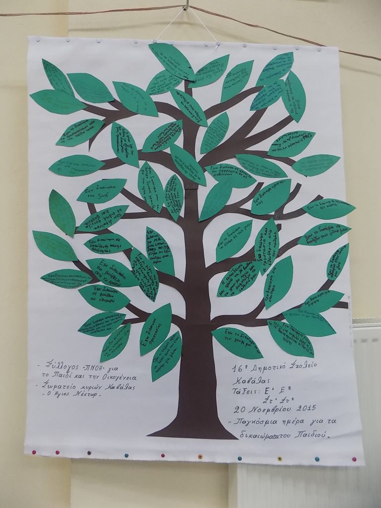 Παγκόσμια Ημέρα των ΔΙΑΚΑΙΩΜΑΤΩΝ ΤΩΝ ΠΑΙΔΙΩΝ. Αυτή την ημέρα μέλη των Δ.Σ. & εθελοντές του ΦΙΛΑΝΘΡΩΠΙΚΟΥ ΣΩΜΑΤΕΙΟΥ ΚΥΡΙΩΝ ΚΑΒΑΛΑΣ “Ο ΑΓΙΟΣ ΝΕΣΤΩΡ” & του Σύλλογος Πνοή επισκεφτήκαμε πολλά δημοτικά σχολεία της πόλης μας όπως τα: 16ο, 7ο, 2ο, 11ο και 17ο. Εκεί μαζί με τα παιδιά μιλήσαμε για τα μηνύματα της Παγκόσμιας Ημέρας, ανταλλάξαμε σκέψεις , τραγουδήσαμε και φυσικά φτιάξαμε και το δένδρο των δικαιωμάτων που στολίζει από τότε το χώρο του κάθε σχολείου. Φέτος δυστυχώς η συγκεκριμένη δράση λόγω των δύσκολων συνθηκών που επικρατούν δεν έγινε. Με την ευχή να μπορέσουμε του χρόνου να κάνουμε και πάλι σε ένα άλλο Δημοτικό της πόλης μας την τόσο επιτυχημένη ενημερωτική δράση, ανεβάζουμε φωτό των περασμένων ετών.