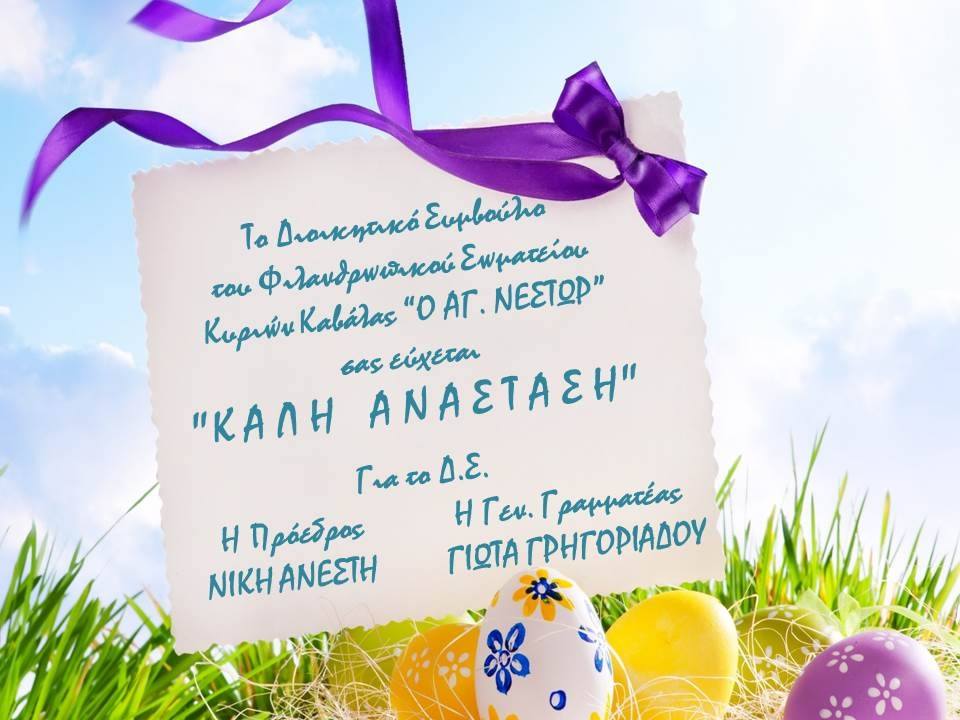 Η Πρόεδρος και τα μέλη του Διοικητικού Συμβουλίου του Φιλανθρωπικού Σωματείου Κυριών Καβάλας “Ο ΑΓΙΟΣ ΝΕΣΤΩΡ” ευχόμαστε “ΚΑΛΗ ΑΝΑΣΤΑΣΗ”, ΕΙΡΗΝΗ ΚΑΙ ΑΓΑΠΗ σε όλο τον κόσμο.