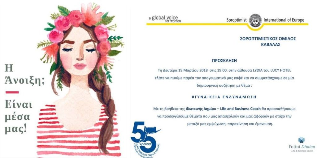 Αναρτούμε την πρόσκληση που πήραμε από τον Σοροπτιμιστικό Όμιλο Καβάλας για την εκδήλωση-δημιουργική συζήτηση που θα γίνει τη 19-3-18 και ώρα 19.00 στο ξενοδοχείο LUCY , με θέμα “ΓΥΝΑΙΚΕΙΑ ΕΝΔΥΝΑΜΩΣΗ”. Τιμή πρόσκλησης 5Ε